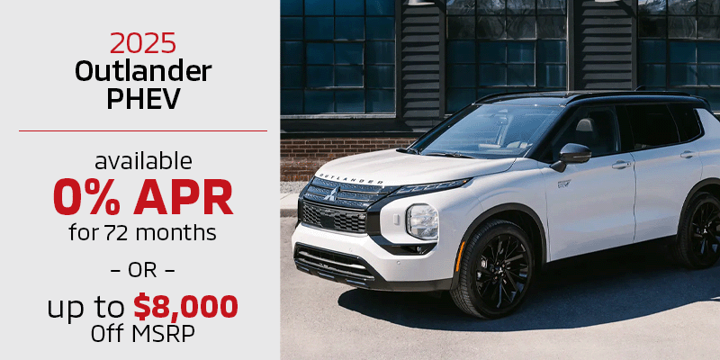 0.0% APR for 72 months (72 monthly payments of $13.89 per $1,000 financed at 0.0% APR with $0 down payment) Available through Santander Consumer USA, subject to approved credit and insurance. Not all customers will qualify. Price, terms and vehicle availability may vary. This offer may not combine with factory cash rebates. See your participating Mitsubishi dealer for details. *$8,000 below MSRP Heritage Discount on all 2025 Outlander PHEV models. No cash value, see dealer for details. Must qualify and finance with preferred dealer lenders